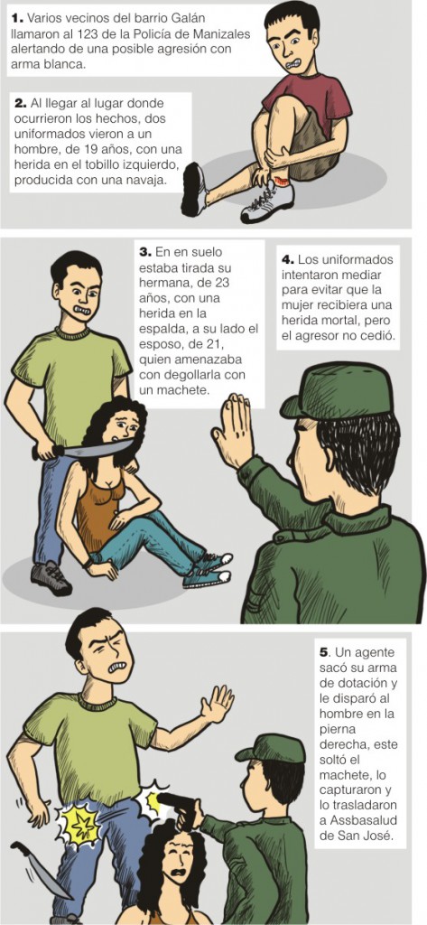 Sin embargo, dos policías que acudieron al llamado de socorro de habitantes del barrio Galán, en la calle 31 con carrera 9B, lo redujeron luego de dispararle y hacerle perder el equilibrio.