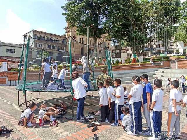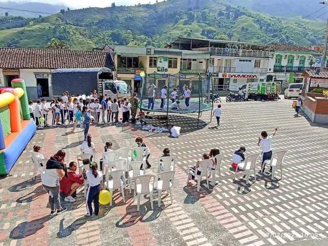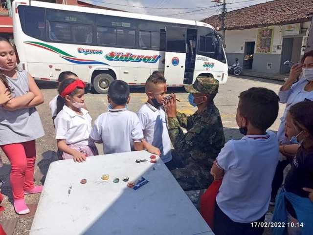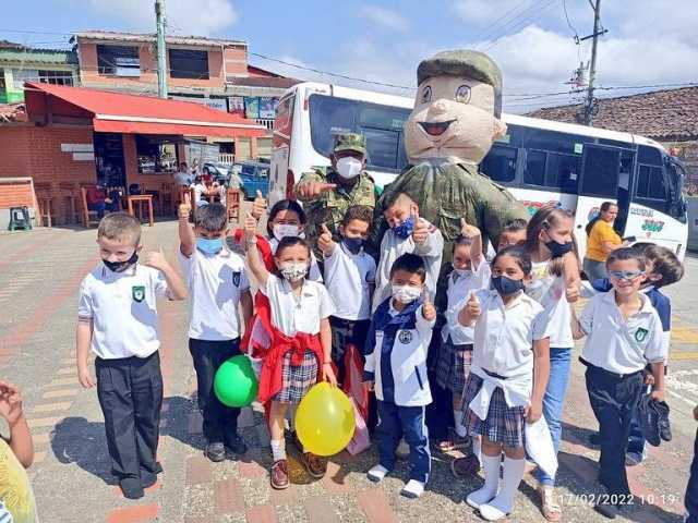 Pácora. "Cómo no caminar largas jornadas y recorrer kilómetros, si son las sonrisas de los niños y el bienestar de nuestro pueblo caldense lo que justifica la misión", dijo el Ejército. En Pácora hicieron, con los niños de la escuela Marco Fidel Suárez, una jornada lúdico-pedagógica.