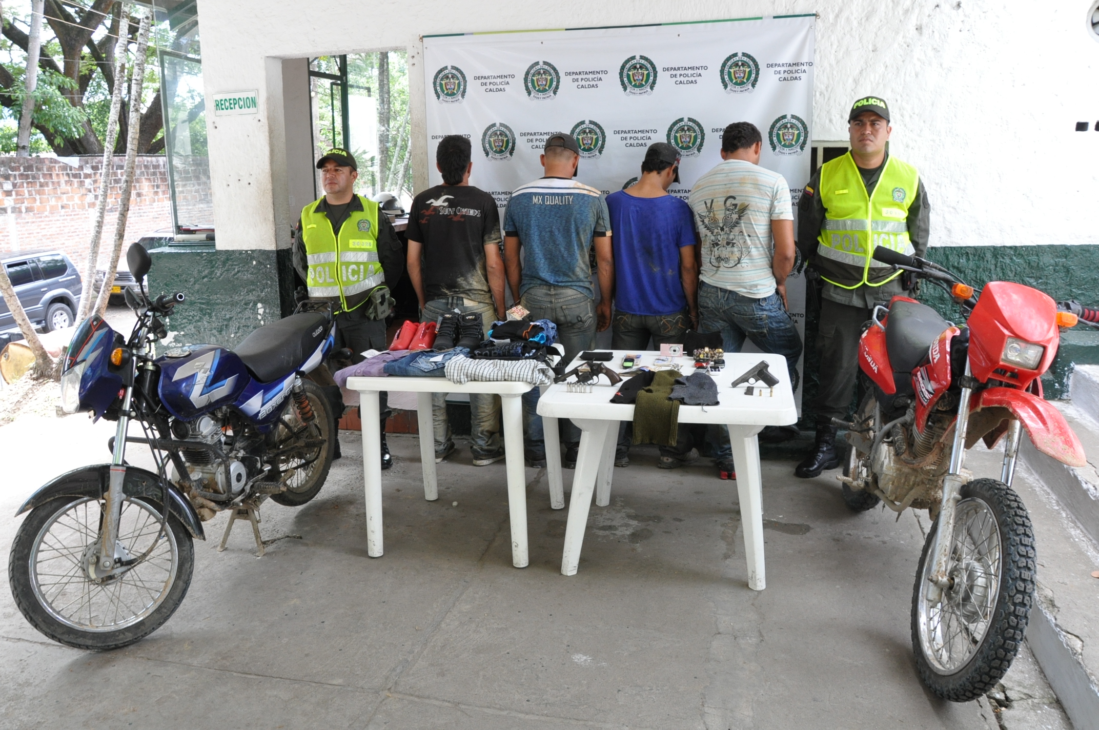 Cuatro asaltantes de fincas cayeron en poder de la Policía ayer luego de su última fechoría, cometida en zona rural de Norcasia. Aunque los delincuentes intentaron enfrentarse con los dos uniformados que los pararon en el camino, finalmente fueron capturados.