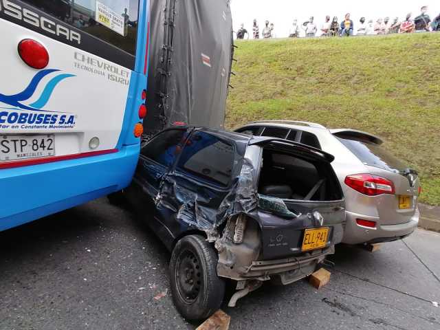 El accidente por poco termina en tragedia. Un camión cargado se devolvió en una pendiente y embistió a una buseta de Socobuses, con 18 pasajeros, y dos carros particulares: Twingo y Renault Koleos. Tres personas resultaron lesionadas y fueron atendidas por Bomberos, Defensa Civil y GER. Los socorristas indicaron que valoraron a 22 personas. Ocurrió cerca del Parque Caldas, por detrás del CAI.
