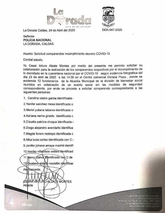 "Era un reunión sin licor, ni música": Multaron a 12 empleados de la Alcaldía de la Dorada