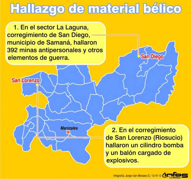 Hace una semana el Batallón Ayacuchó, como lo informó LA PATRIA, descubrió una caleta con 392 minas antipersonales en zona rural de Samaná, en límites con Antioquia. Junto con el material bélico había cuatro mechas de cordón detonante, 241 detonadores eléctricos y cuatro barras de indugel.