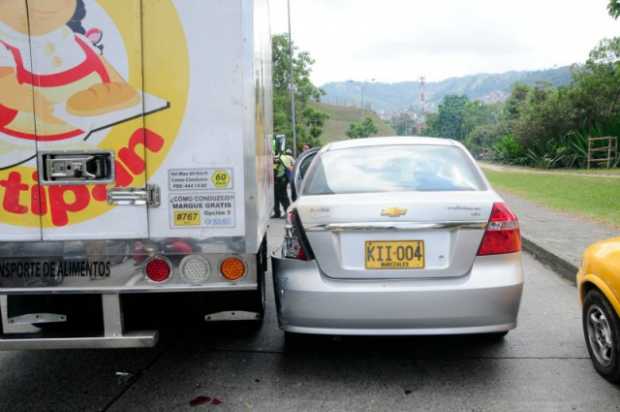 Un furgón que transporta alimentos para la empresa Natipán colisionó con un carro particular de placas KII004, en la Avenida Kevin Ángel (Manizales), a la altura de la entrada del barrio Peralonso.