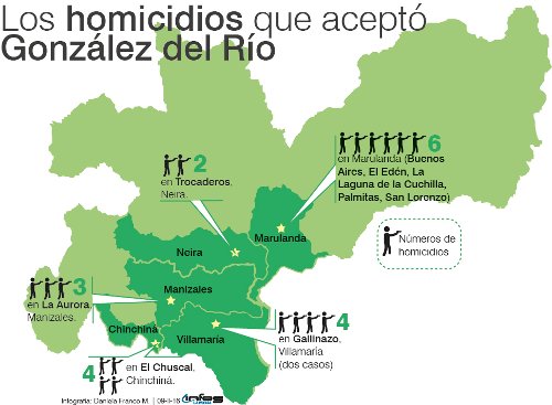González del Río inicialmente purgaría una pena de 52 años, pero por la aceptación de cargos le rebajaron a 36 años y seis meses, y tendrá que pagar mil 986 millones de pesos por homicidio en persona protegida, concierto para delinquir agravado, porte ilegal de armas de fuego y falsedad en documento público.