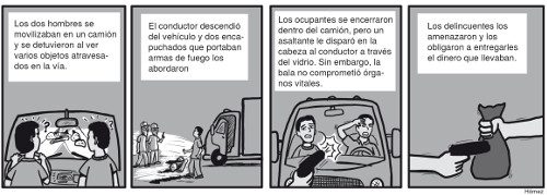 Dos presuntos asaltantes interceptaron un camión en el corregimiento Santa Elena, de Marquetalia, el pasado viernes y le hurtaron el dinero a sus ocupantes. Hirieron al conductor en la cabeza, pero está fuera de peligro.