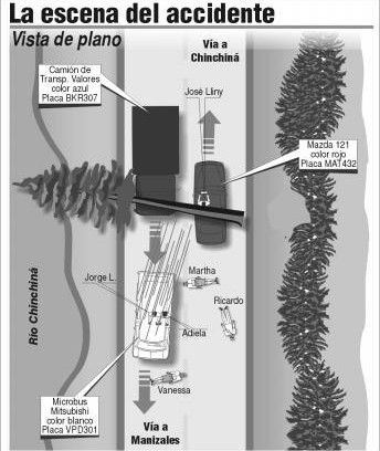 Ocurrió el 12 de junio del 2002 en la vía Chinchiná-Manizales, sector El Pescador. Un árbol cayó sobre la vía. Por el hecho, el Invías deberá indemnizar con $2 mil 400 millones a los familiares de los fallecidos.