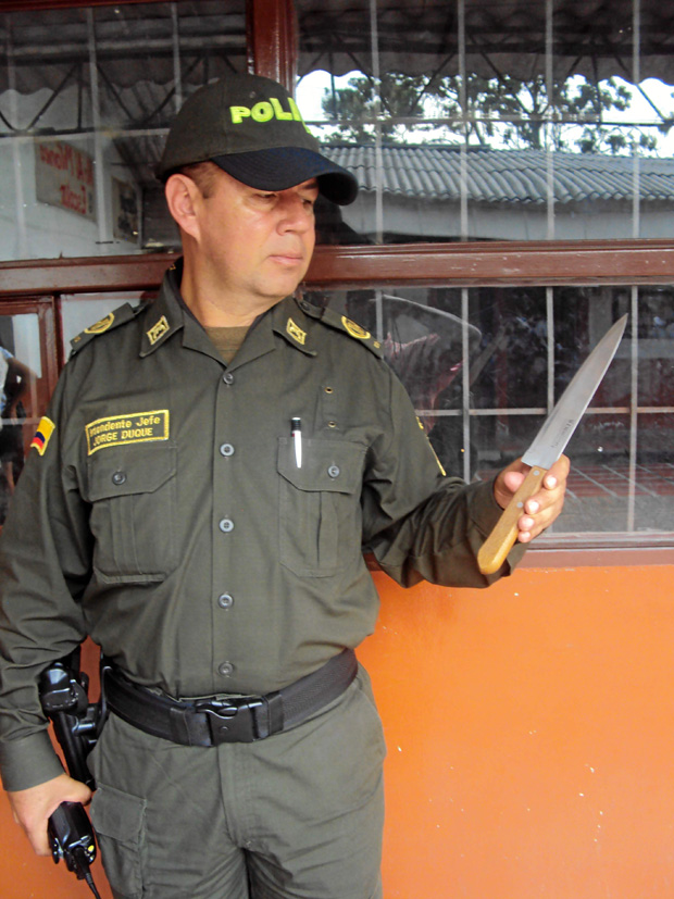 La Policía de Chinchiná acudió ayer a la institución educativa Bartolomé Mitre. Se trató de un operativo de búsqueda de armas y sustancias estupefacientes. Durante el registro adelantado en las aulas los uniformados se incautaron de una dosis de marihuana, una pipa para el consumo de bazuco y 12 armas blancas. Los agentes se sorprendieron con el tamaño de este cuchillo, que muestra el intendente jefe Jorge Dique. El portador era un adolescente.