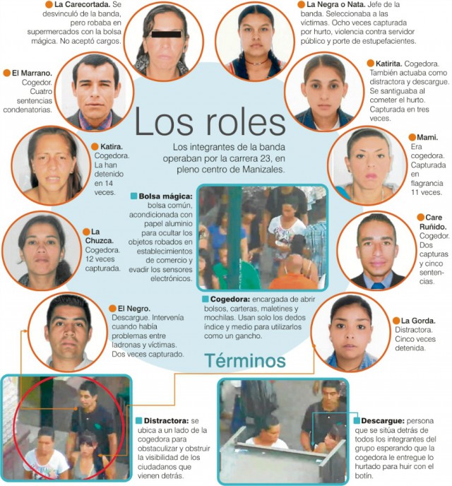 Manuel Arias, subdirector de la Fiscalía Caldas, explicó que les imputaron concierto para delinquir (les demostraron que trabajaban en equipo), en concurso con hurto agravado y, a otros, con hurto agravado y calificado. "Se les manda el mensaje de que delinquir no paga. Esperamos hacer más capturas", dijo.