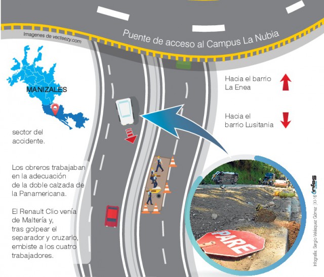 Un vehículo, con tres ocupantes, se volcó luego de impactar contra un separador entre la entrada a la Enea y el barrio Lusitania, jurisdicción de Manizales. El carro, un Renault Clio modelo 2015, de placas UCK 960, atropelló a cuatro obreros. Trabajaban en las obras de la doble calzada de la vía Panamericana.