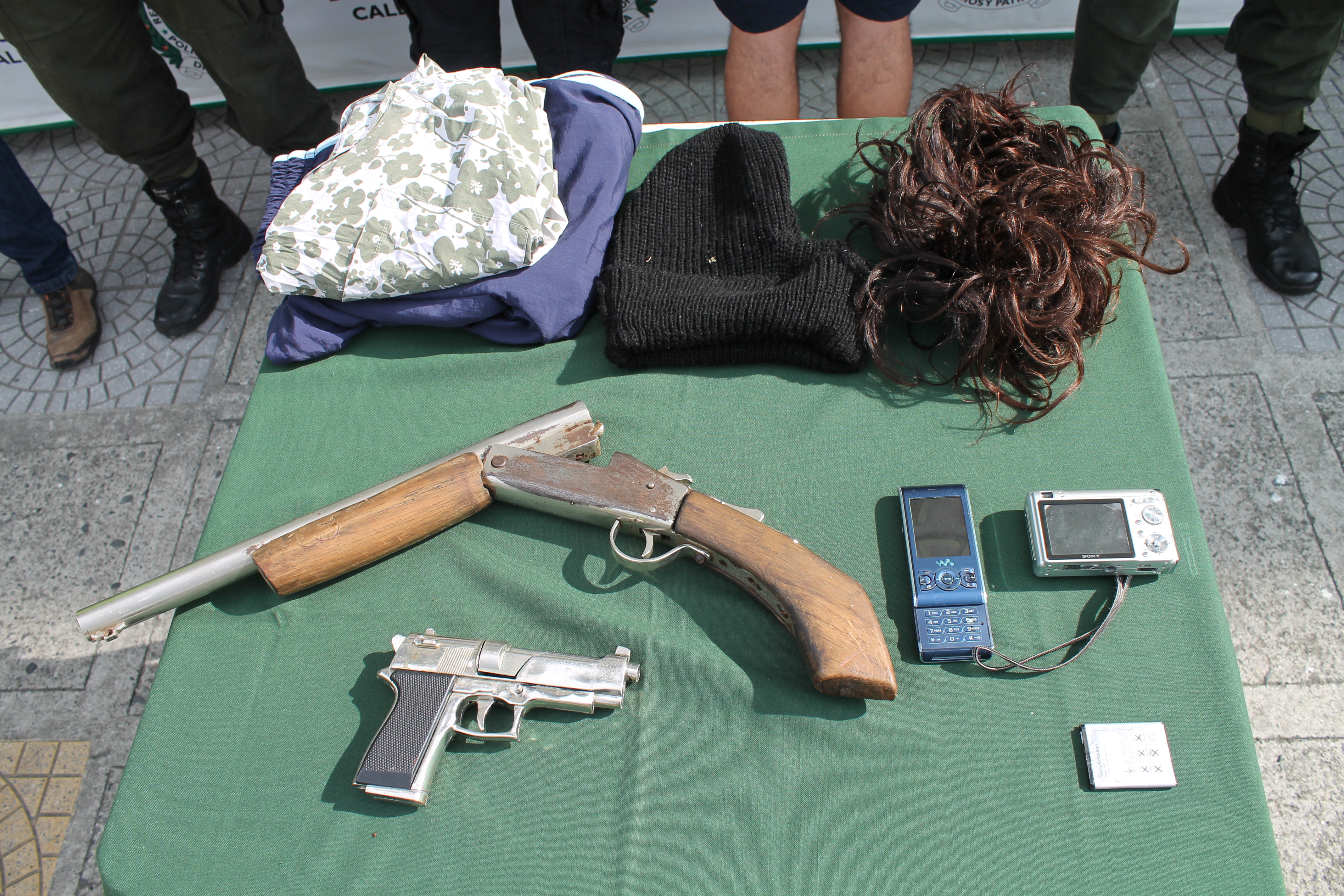 La propietaria permitió el ingreso de los uniformados, que también rodearon el lugar y terminaron por capturar a los malhechores en una habitación del segundo piso. En la inspección encontraron una escopeta artesanal, una pistola de juguete, una peluca y vestimenta de mujer. Así mismo, recuperaron y le entregaron a su dueño una cámara digital fotográfica marca Sony y un celular Sony Ericsson.