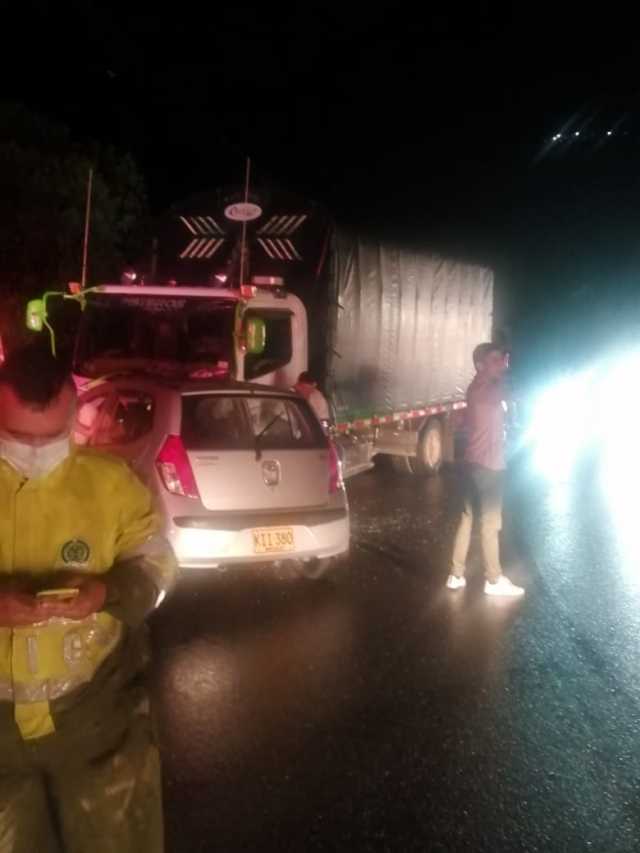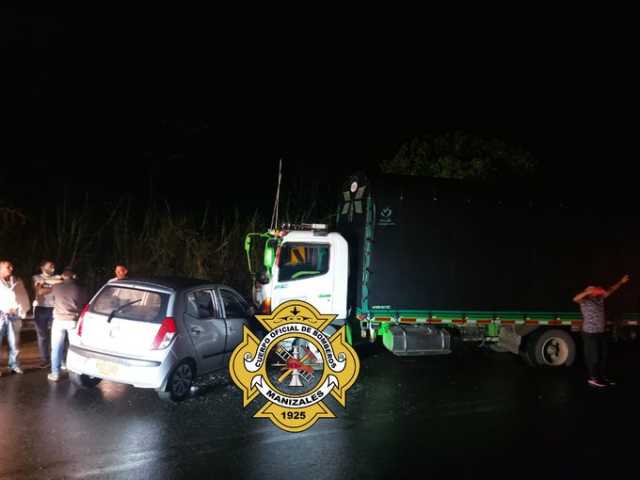 Un carro particular chocó anoche contra un camión en la vía Manizales-Chinchiná. El conductor perdió el control por el piso mojado en una curva.