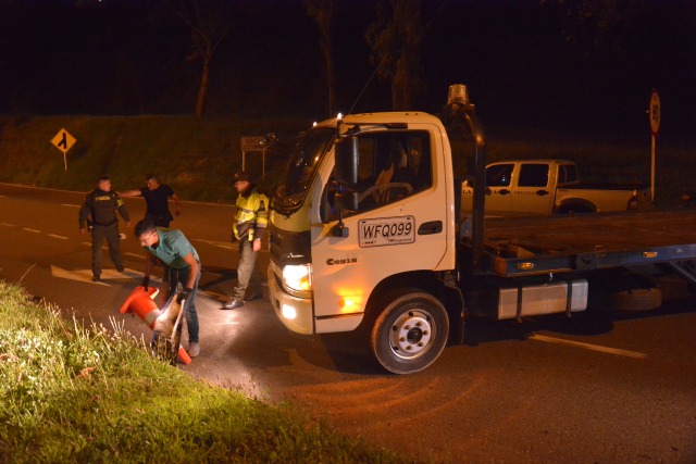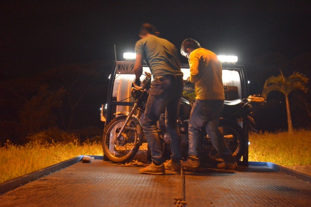 Los de tránsito revisaban moto por moto, usando incluso la linterna de los celulares. A las 8:22 descendieron tres vehículos de estos, con parejas, pero al ver el retén tomaron el retorno y regresaron hacia Manizales. Unos más pasaban a alta velocidad, desafiando a las autoridades. A las 8:27 subieron la segunda moto a la grúa, mientras otro planchón arribó al lugar.