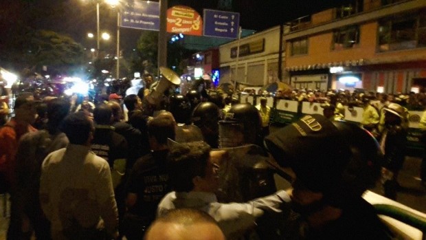 En la madrugada de ayer la Policía envió un pronunciamiento en el que asegura: "en este hecho, se evidenció a través de las cámaras de seguridad de la ciudad que un manifestante lanzó un artefacto explosivo contra los policías que allí se encontraban de servicio ocasionando lesiones a tres uniformados y a un participante de la protesta". Las afectaciones a los agentes, al parecer, fueron leves.