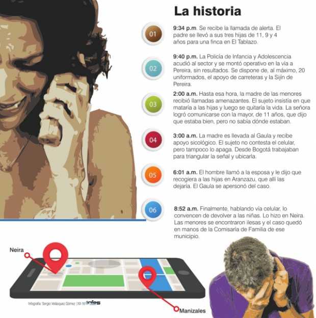 Este fue el comienzo de un caso que tuvo en vilo a las autoridades durante 11 horas, hasta las 8:52 de la mañana de ayer. Afortunadamente el final fue feliz, porque las dos menores están vivas e ilesas. Su padre, luego de una discusión con la esposa, se las llevó y amenazó con matarlas. La Policía las rescató en Neira y las dejó en manos de la Comisaría de Familia, que determinará qué pasó seguir ( ver infográfico).
