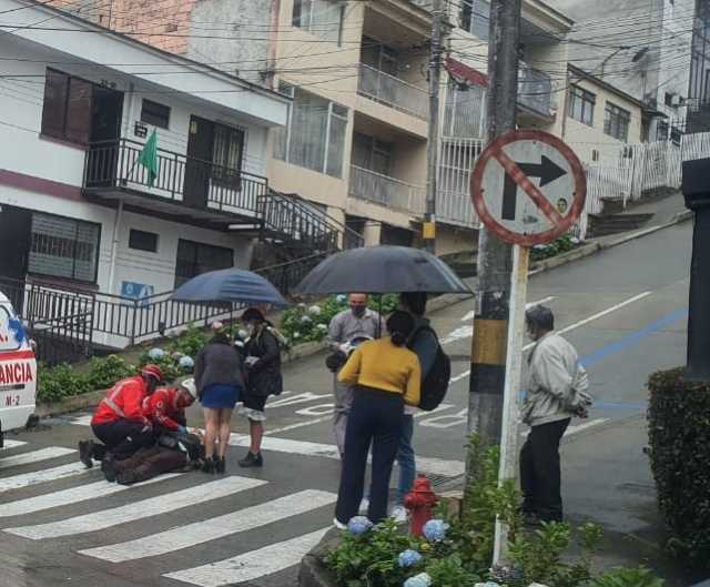 Luz Angela Hoyos Rodríguez, de 42 años, resultó lesionada al caer al suelo en su moto tras resbalar por el asfalto húmedo en la carrera 24 con 59, en La Estrella Manizales.