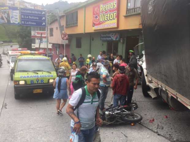 Sin frenos se quedó, a las 12:45 de la tarde de ayer, un camión de placas QAH 344 de Bello, que descendía entre la Universidad Autónoma y la salida hacia Neira. El conductor trató de maniobrar el vehículo y chocar contra algo, para evitar una tragedia.