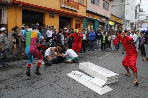 Los improvisados actores marcharon por la Galería con un ataúd blanco. También hicieron la representación en la calle 20 con carrera 17, donde salieron curiosos de los bares Lido, El Prado y la Pirámide. No faltó el que se asustó y se le arrimó a la Policía. Al final, con aplausos, los curiosos y trabajadores del sector mostraron su compromiso con la campaña.