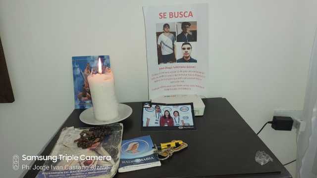 La familia ubicó un altar en la entrada de la residencia, sobre una mesa. Hay un velón prendido, un rosario, la novena a la Virgen y un afiche con la foto de Juan Diego, que dice en letras sobresalientes: Se busca. Si lo ha visto, llame a los teléfonos 3108293200 y 3113800221.