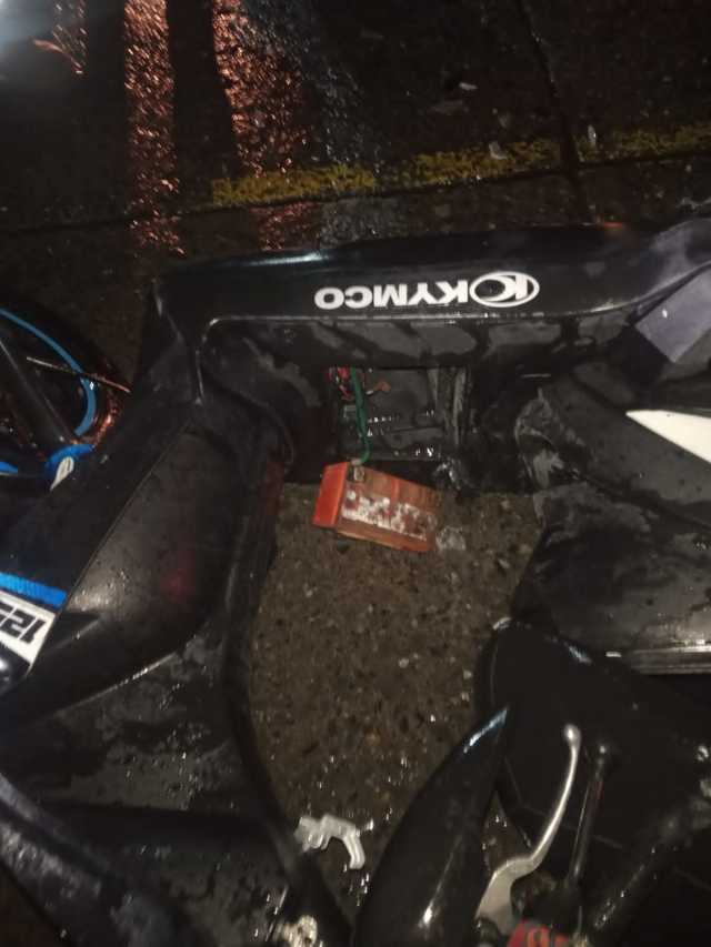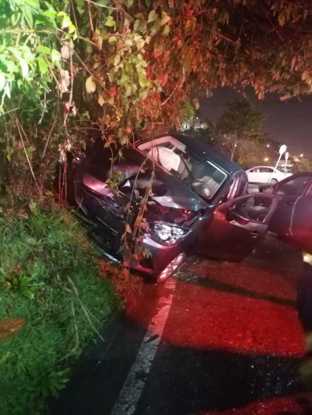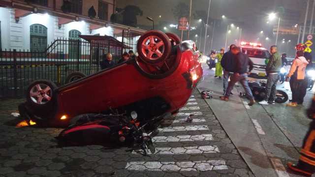 Manizales. En la noche del sábado este carro colisionó contra tres motocicletas que se encontraban a la orilla de la vía. Los ocupantes de esta últimas, a la llegada de ByR, ya se habían bajado y los de carro no se dejaron valorar. Salieron con ayuda de vecinos. El conductor del carro marcó grado dos de alcoholemia, según las autoridades.