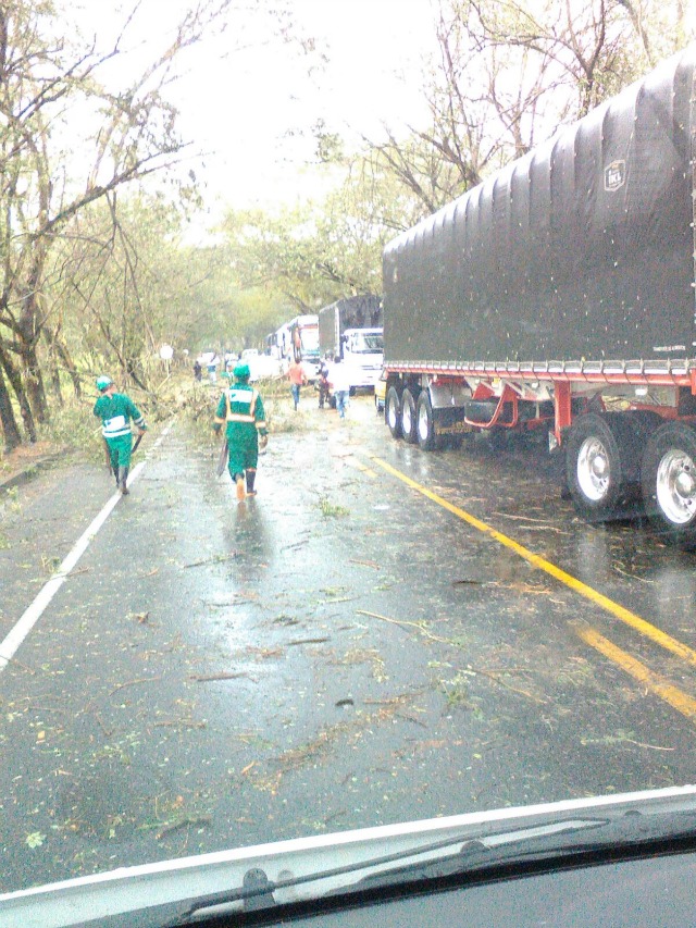 Un torrencial aguacero destruyó las ramas de árboles en la vía de conduce de Manizales a Supía. El tránsito en se encuentra obstruído, hasta que el personal termine de despejar las ramas.