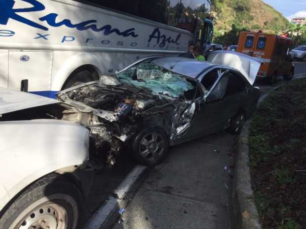 Un aparatoso accidente entre tres vehículos ocurrió en la mañana de ayer en la vía Manizales-Chinchiná, sector de la vereda Aguabonita.