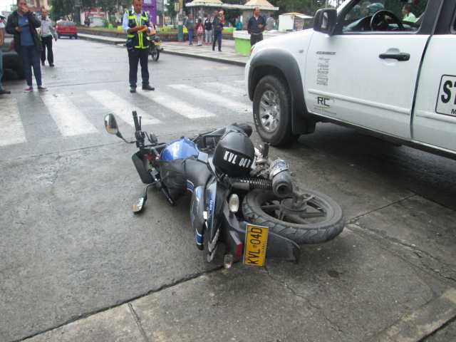 Hoy a las 9:00 a.m. se presentó un accidente de tránsito entre una moto y una camioneta en la esquina de la calle 10 con carrera 7a, frente a la sede de la Alcaldía de Riosucio. En el impacto resultó lastimada la mujer que se transportaba en la moto.
