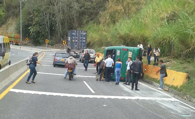 Una buseta de la empresa Transarmenia se volcó hoy al mediodía en el kilómetro 19 de la doble calzada Manizales-Chinchiná, en el sector de San Peregrino, unos metros más abajo del puente de La Estampilla.