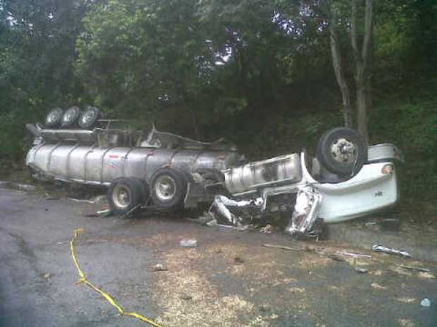 Así lo confirmó el comandante de la Policía de Tránsito y Transporte de Caldas, mayor Fernando Alonso, quien a esta hora se dirige hacia el lugar del accidente, ocurrido en el kilómetro 9 + 800 del trayecto entre Fresno y Mariquita (Tolima). Según la información dada al oficial, tras el volcamiento el derrame del químico fue parcial y no total, lo que hubiera agravado la situación.