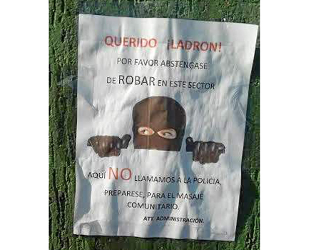 Villamaría. Habitantes de un sector del municipio ubicaron este aviso para que los ladrones no los visiten. Se les advierte que en vez de llamar a la Policía ellos mismos les hacen un masaje comunitario. Mal mensaje de la justicia por propia mano.