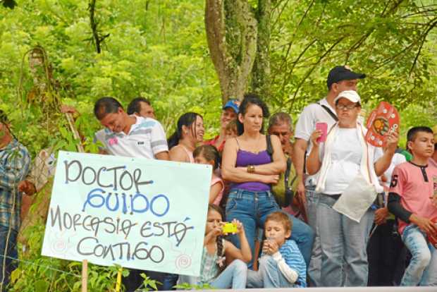 Puente Linda (Pensilvania). El apoyo al gobernador de Caldas, Guido Echeverri, ante la posible suspensión de su cargo por el Consejo de Estado, no se hace esperar en ningún evento. Pancartas, como esta de habitantes de Norcasia, se exhiben en actividades como el encuentro por la Vía del Renacimiento del sábado en límites de Caldas y Antioquia.