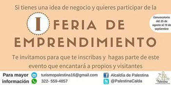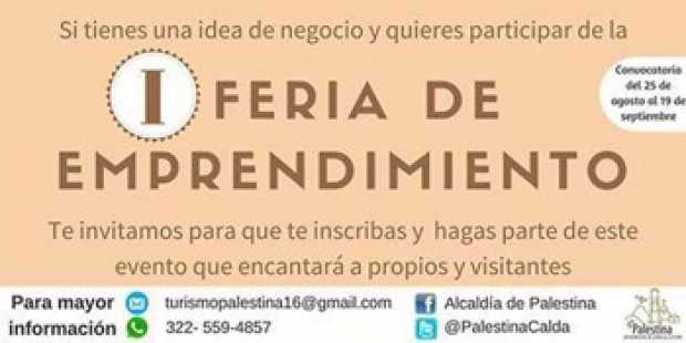Palestina. Están abiertas las inscripciones para la primera Ferial del Emprendimiento a realizarse en octubre, que es patrocinada por la Cámara de Comercio de Chinchiná y la Alcaldía local. Mayores informes en el celular 3225594857.