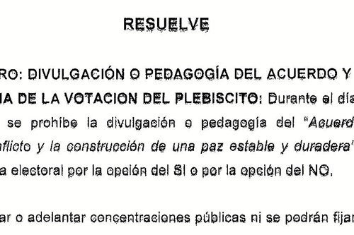 Bogotá. Los señores del Consejo Nacional Electoral decidieron mediante resolución publicada el jueves pasado que hoy, día de la votación del Plebiscito, no se puede hacer pedagogía del contenido del Acuerdo que vamos a votar. Difícil una prohibición más inconstitucional, cuando lo que se busca que haya amplia participación bien informada en las votaciones. Definitivamente este organismo necesita una seria revisión en su estructura.