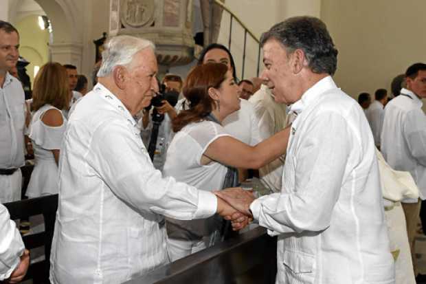 Cartagena. El expresidente Belisario Betancur, en la Iglesia San Pedro Claver, donde asistió para la ceremonia de Liturgia de la Palabra y Oración por la reconciliación de Colombia, saludó efusivamente al presidente Juan Manuel Santos y lo felicitó por el logro de la paz. Betancur también intentó la firma de un acuerdo similar con las Farc durante su gobierno.
