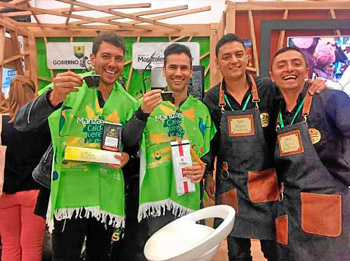 Bogotá. Los propietarios de Santokaffeto, Germán Andrés Restrepo y Germán Andrés Hurtado, participaron de la vitrina de Caldas en la feria de turismo Anato, en Bogotá. Ellos compartieron un café con los manizaleños Sebastián Gómez y Federico González, miembros de Sanalejo.