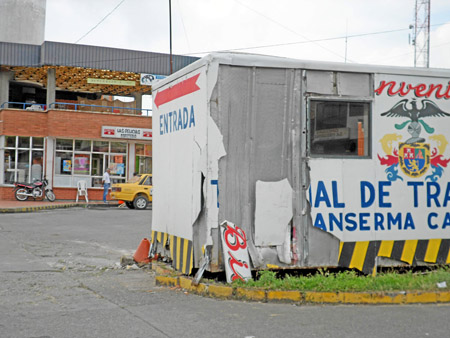 Anserma. El pasado domingo en la noche un vehículo de servicio público intermunicipal chocó contra la caseta de control de entrada y salida de vehículos ubicada la terminal de transportes. Según varios testigos, el conductor de una buseta que cubría la ruta Riosucio-Anserma se bajó a unos cien metros del lugar para hacer un chance, con tan mala suerte que el vehículo se desengranó y llegó hasta la caseta, averiando gravemente el cubículo. Por fortuna no había nadie en su interior. La administración negocia con la empresa comprometida para poder ejecutar las reparaciones.