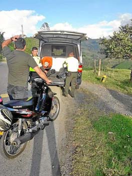 Manizales. Andrés Orozco publicó estas fotos en Facebook para resaltar la ayuda que le dieron estos dos policías, el sábado, en la vía antigua a Chinchiná. Su moto se pinchó y los uniformados lo auxiliaron llevándolo con su vehículo hasta un montallantas en Manizales.