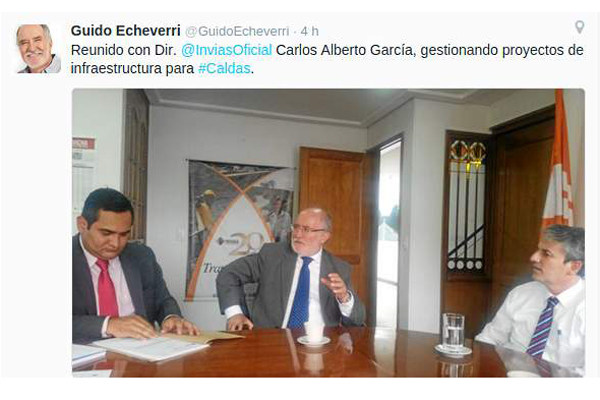 Manizales. El gobernador de Caldas, Guido Echeverri Piedrahíta, estuvo esta semana en Bogotá, gestionando recursos para varios proyectos del departamento, entre ellos algunos que requieren inversiones del Instituto Nacional de Vías (Invías), gerenciado por el también caldense Carlos Alberto García. Hasta ayer, el mandatario no había recibido la notificación de su suspensión provisional, dictada por el Consejo de Estado.