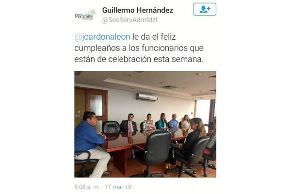 Manizales. El alcalde de Manizales, Octavio Cardona, como una forma de tener mayor proximidad con los funcionarios de la administración, celebra en su despacho a los empleados los cumpleaños de cada semana. Aprovecha para escuchar inquietudes e ideas.