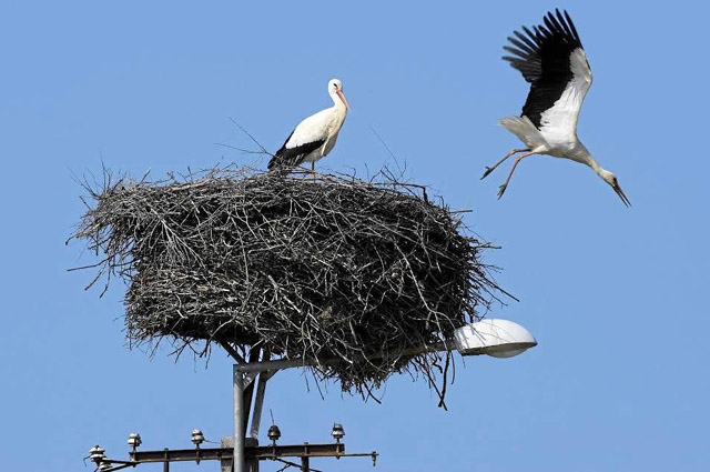 Görbeháza (Hungría). Una pareja de cigüeñas blancas (Ciconia ciconia) volvieron a su nido por la época estival de cría. Su particular hogar está construido en la parte superior de un poste de luz de la calle de esta ciudad, a 183 kilómetros de Budapest. La cigüeñas blancas anidan en Hungría durante esta época y vuelan hacia el sur en agosto y septiembre, siguiendo la ruta migratoria sobre la estrecho de Bósforo y el Canal de Suez para pasar el invierno en África.
