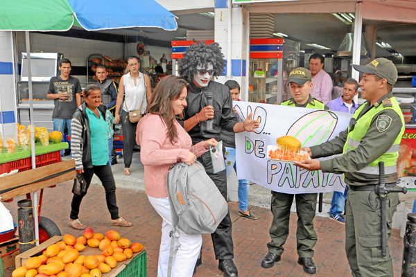 Manizales. Para evitar que los ciudadanos de Manizales y Villamaría sean víctimas de delitos de robos y atracos, la Policía Metropolitana viene desarrollando una campaña que invita a “no dar papaya”. Con ese objetivo, ciudadanos que transitaban por la Carrera 23 de Manizales fueron sorprendidos por la Policía dando papaya, y se les invitó a que sean más precavidos. Un agente disfrazado y con el nombre de “caquito” es el encargado de cometer las pilatunas para hacer caer en cuenta a las personas de sus descuidos, que las convierten en víctimas del cosquilleo.