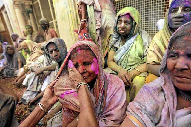 Vrindavan (India). Indios se embadurnan con polvos de colores durante la celebración del Festival Holi en Vrindavan, Uttar Pradesh (India). Las calles se llenaron este fin de semana del sonido de tambores, cantos, bailes y, sobre todo, de muchos colores para dar la bienvenida a la primavera con el festival hindú de Holi, la celebración más divertida y alocada del país.