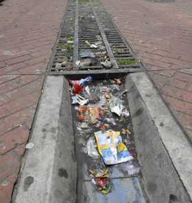 Filtraciones de agua lluvia en la vía principal del barrio Los Prados, de Anserma