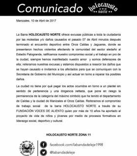 Pronunciamiento del Once Caldas ante sanciones a la barra Holocausto