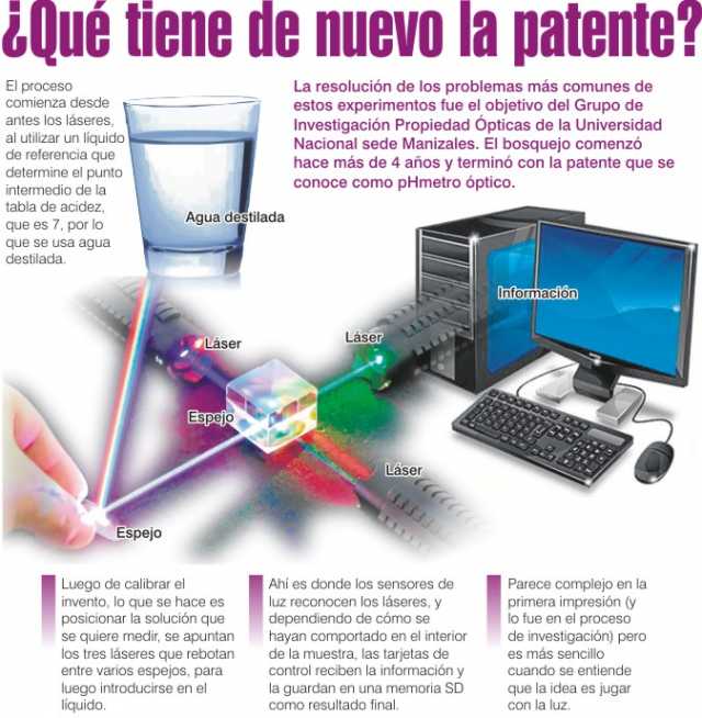La resolución de los problemas más comunes de estos experimentos fue el objetivo del Grupo de Investigación Propiedad Ópticas de la Universidad Nacional sede Manizales. El bosquejo comenzó hace más de 4 años y terminó con la patente que se conoce como pHmetro óptico.