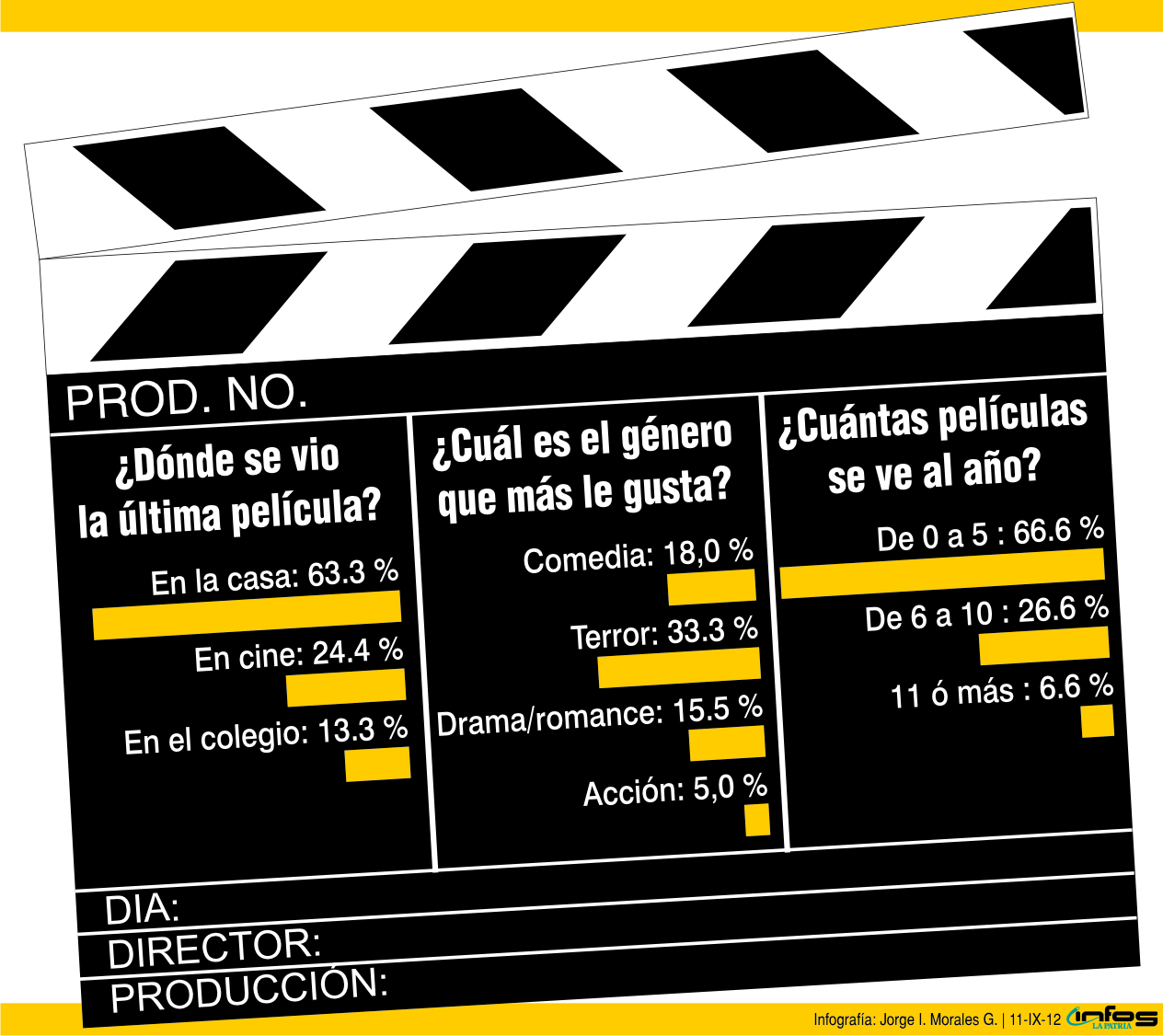 Su testimonio coincide con los resultados de una encuesta realizada por LA PATRIA a 45 jóvenes, entre los 14 y 18 años de colegios de la ciudad. Ellos prefieren las comedias a la hora de escoger una película, ya sea en una sala de cine o en la casa. Hay que destacar que de esta muestra, son pocos los que pagan por ver un filme, y por cuestiones económicas o gusto, prefieren verla en sus casas con familiares o la de algún conocido.