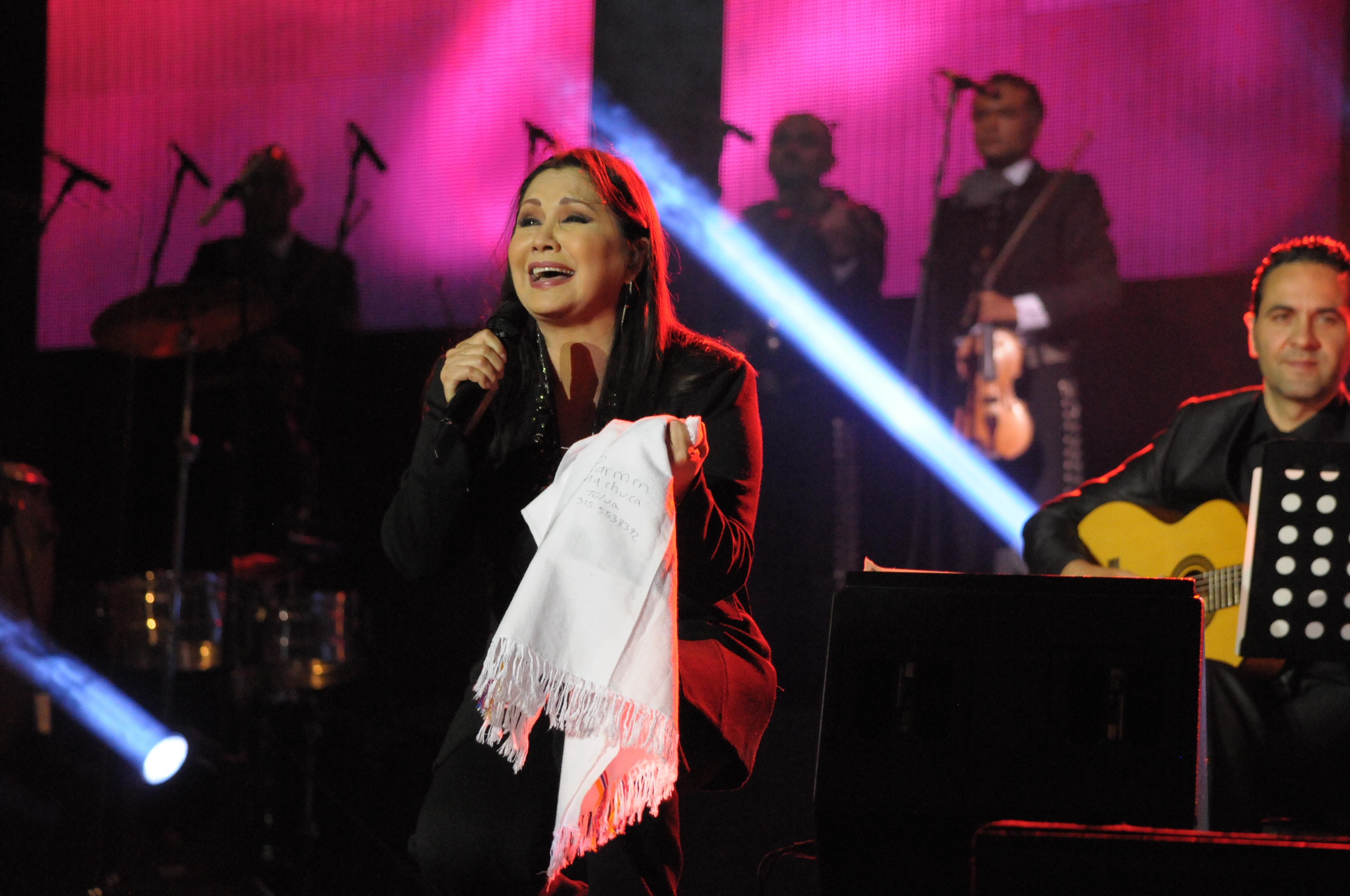 Los 18 músicos de su orquesta la recibieron interpretando la canción Mariachi con tambor, que la artista cantó con esa voz desgarradora que la caracteriza y se mantiene a sus 57 años.