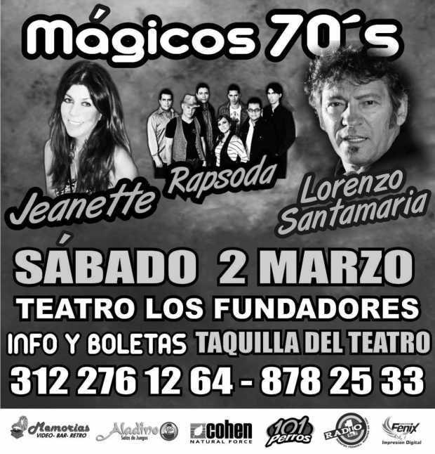 El empresario del concierto Mágicos 70´s, que se realizará el 2 de marzo en el Teatro Fundadores, informó que debido a una enfermedad que aqueja al artista Sergio Denis, este no podrá presentarse en los conciertos en Colombia, donde está incluida la ciudad de Manizales, y fue reemplazado por el español Lorenzo Santamaría. Dentro de la nómina también están Jeanette y Rapsoda.
