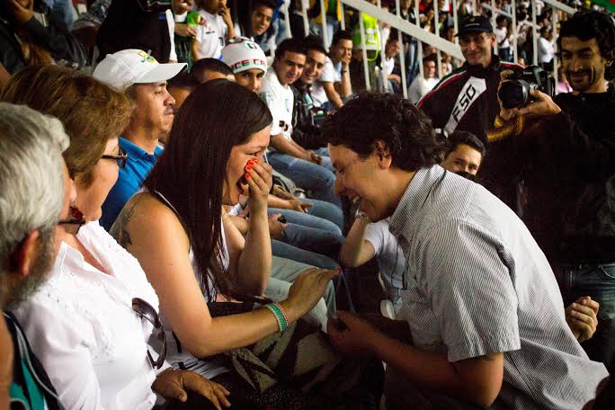 De inmediato su novio que se encontraba una fila abajo de ella se paró de la silla, volteó y se fundieron en un abrazo. Segundos después, Carlos sacó de su bolsillo el anillo de compromiso, Francedy no pudo evitar llorar, su novio buscó su dedo anular y le puso el anillo para sellar el compromiso ante 23 mil espectadores que arribaron ese día al escenario deportivo. Aplausos y gritos se escucharon en la tribuna norte, mientras los prometidos se daban un beso.