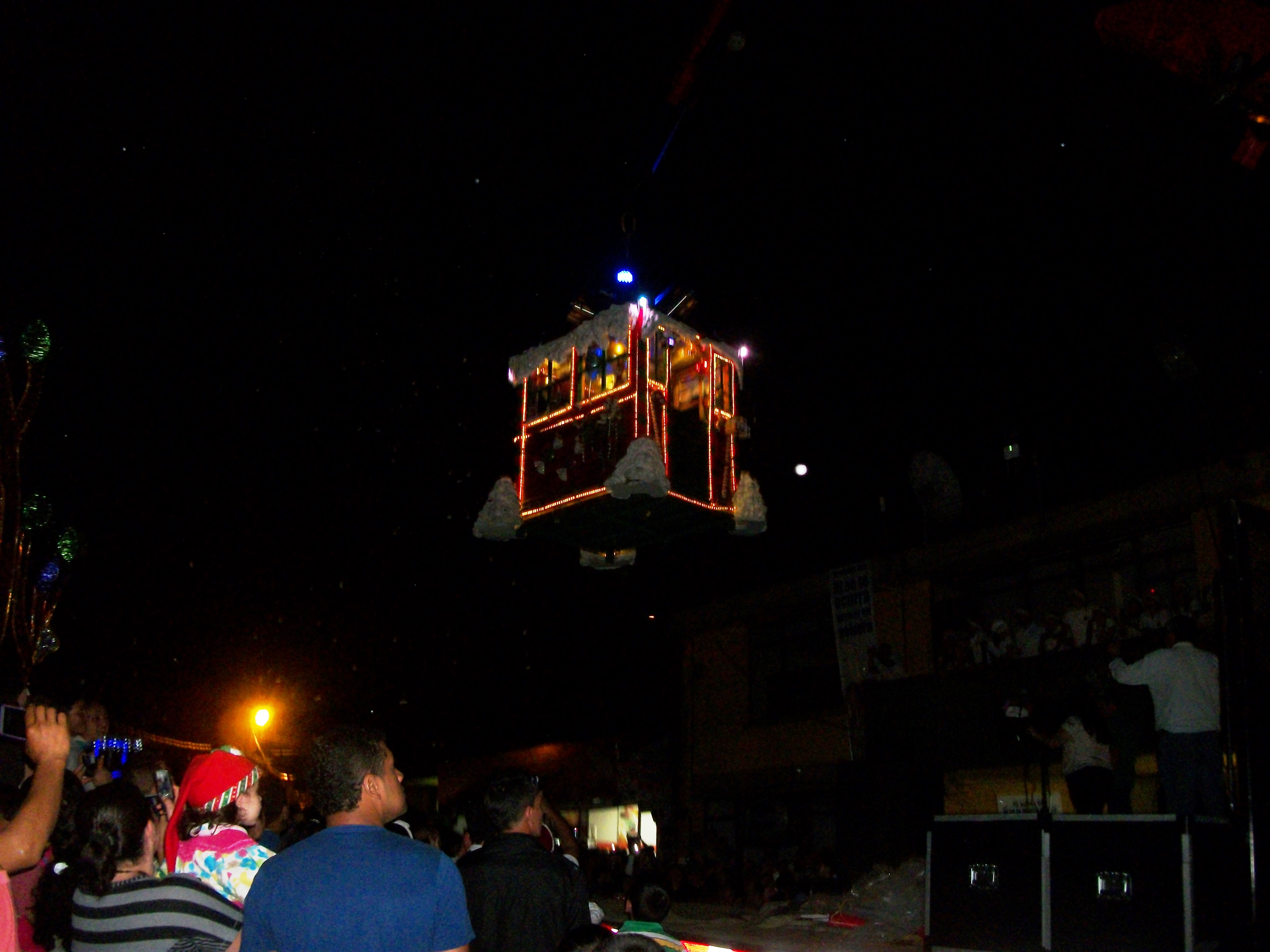 De repente apareció en lo alto de la plaza una pequeña casa roja que atravesó el parque sobre los asombrados espectadores. En el interior estaba Papá Noel junto a su familia. Todo se iluminó de rojo, blanco y verde y el anciano de barba blanca saludó desde la ventana de su hogar. La casa giraba y la nieve empezó a caer sobre los asistentes. Entre los espectadores estaba Carlos Mario Sánchez, quien junto a la tarima no se quería perder ni un segundo de lo que estaba pasando. "Todo quedó bonito, es primera vez que traen nieve", expresó.