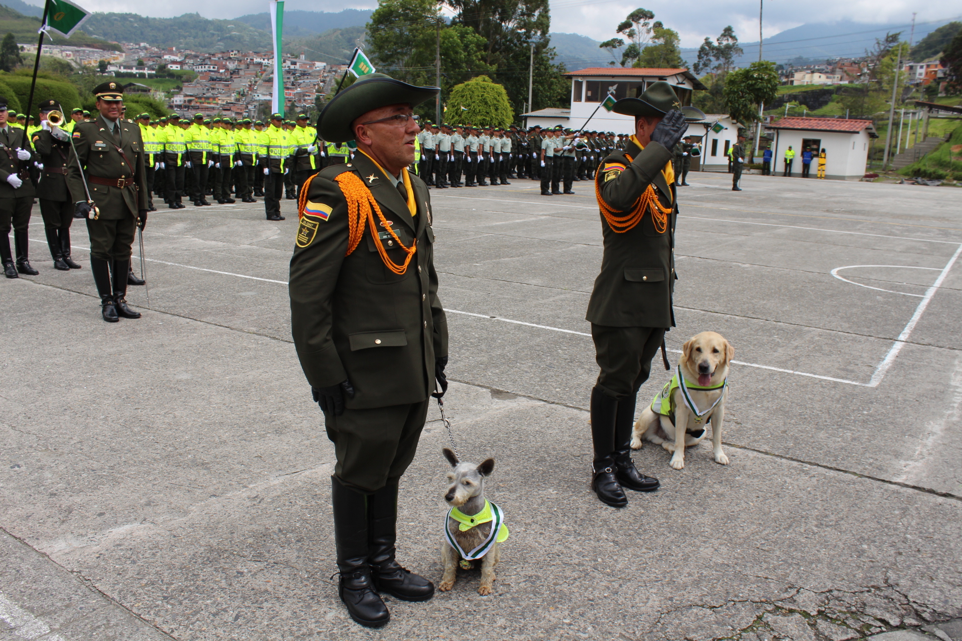 Tommy y Bruno, dos perros que hacen parte de la Policía, recibieron honores el pasado 7 de noviembre en la Escuela de Carabineros Alejandro Gutiérrez. Los distinguieron por su excelente labor en beneficio de la convivencia y la seguridad ciudadana.